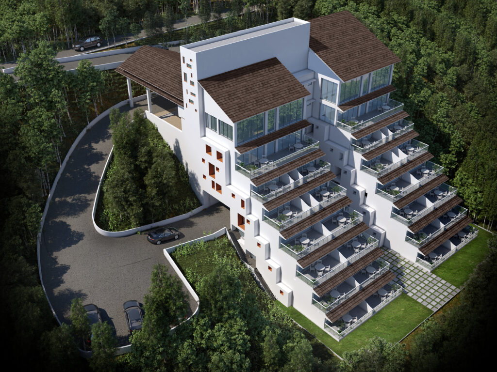 Winterfeel Resort, a prestigious 5-star hotel nestled in the scenic landscape of Wayanad, stands out for its innovative design featuring a stepped form that creates balconies offering captivating views of the surroundings. The hotel’s efficient space management and thoughtful building design along the contour of the land enhance the guest experience and complement the natural beauty of the region.